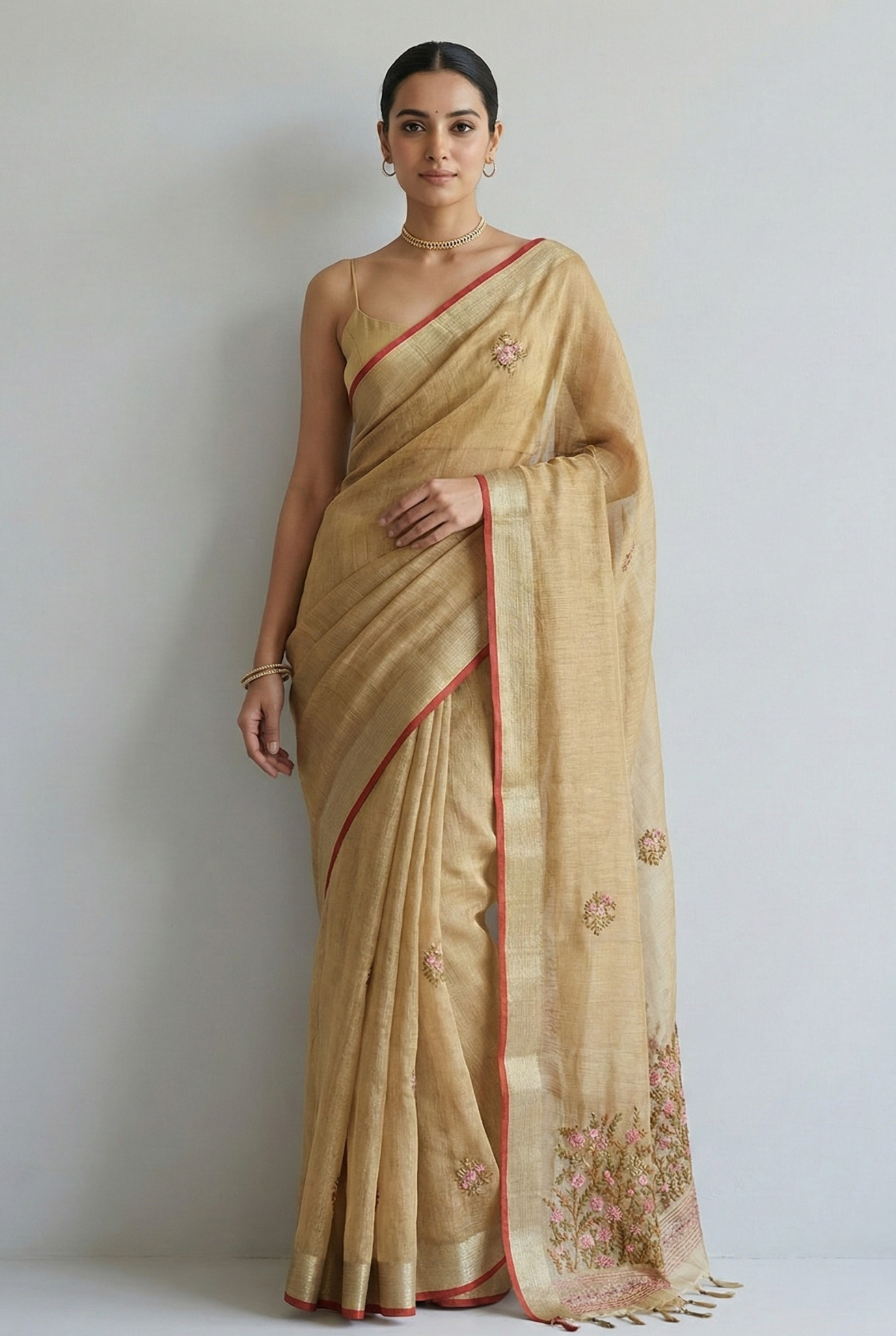 The Saanvi Bloom Linen Tissue Sareecelebrates lightweight luxury and handcrafted detail. Woven in fine linen-tissue, the saree offers a crisp, semi-sheer body that layers with a graceful, airy fall. The main field is punctuated with delicate, regularly spaced floral butis that create a soft, rhythmic texture across the pleats. Perfect for daytime festivities, cultural gatherings, elegant brunches, office ethnic days, and intimate ceremonial occasions — an ideal choice when you want artisanal detail with a light, poised drape.