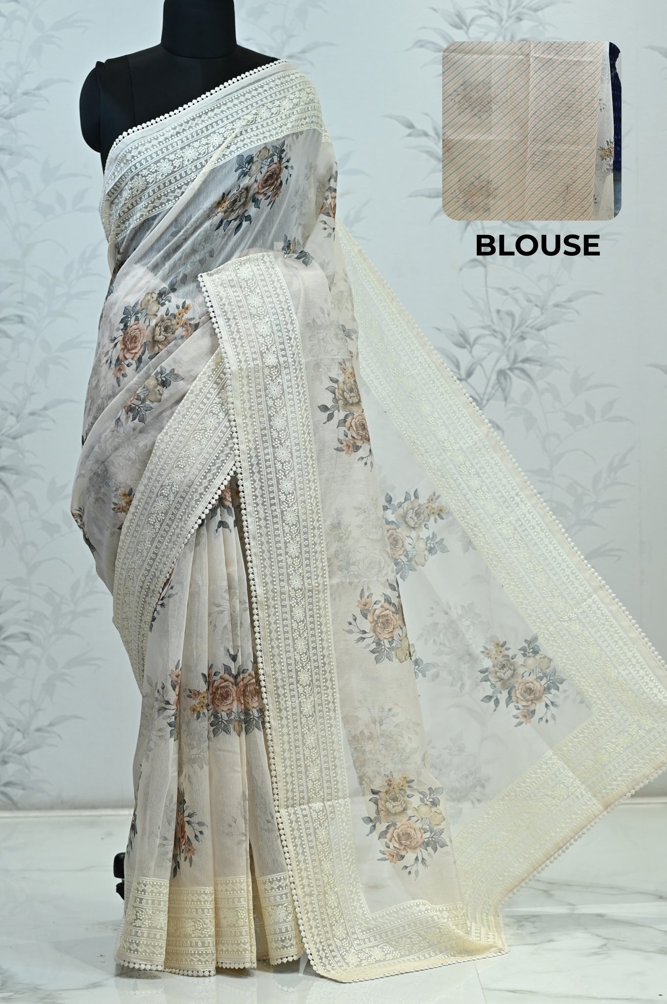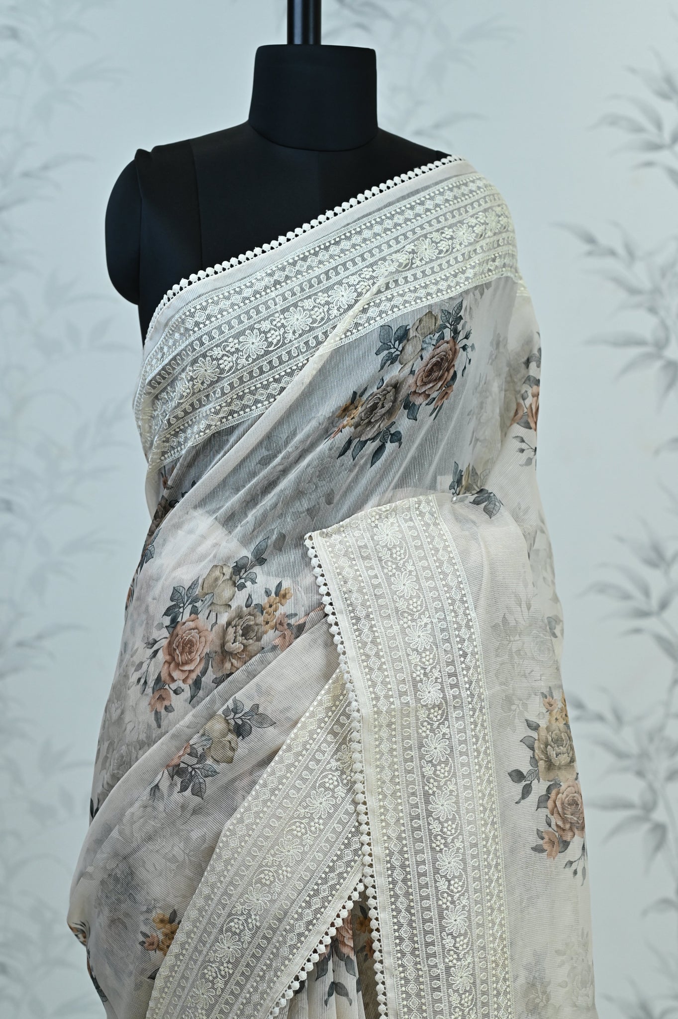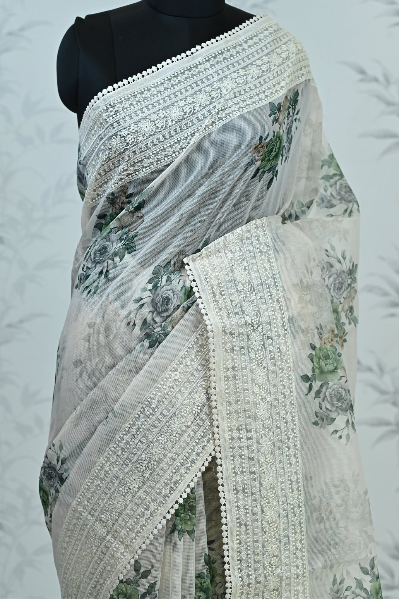 Statement Lace Border – Broad, intricately embroidered lace frames the saree with artisanal depth and sculpted refinement.