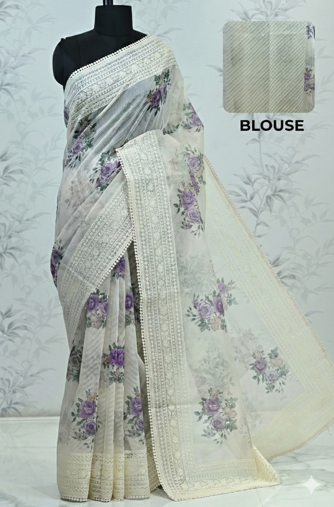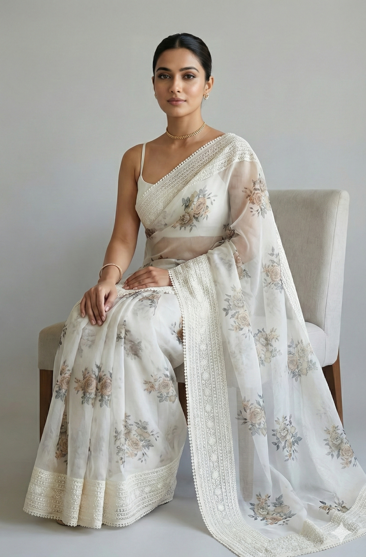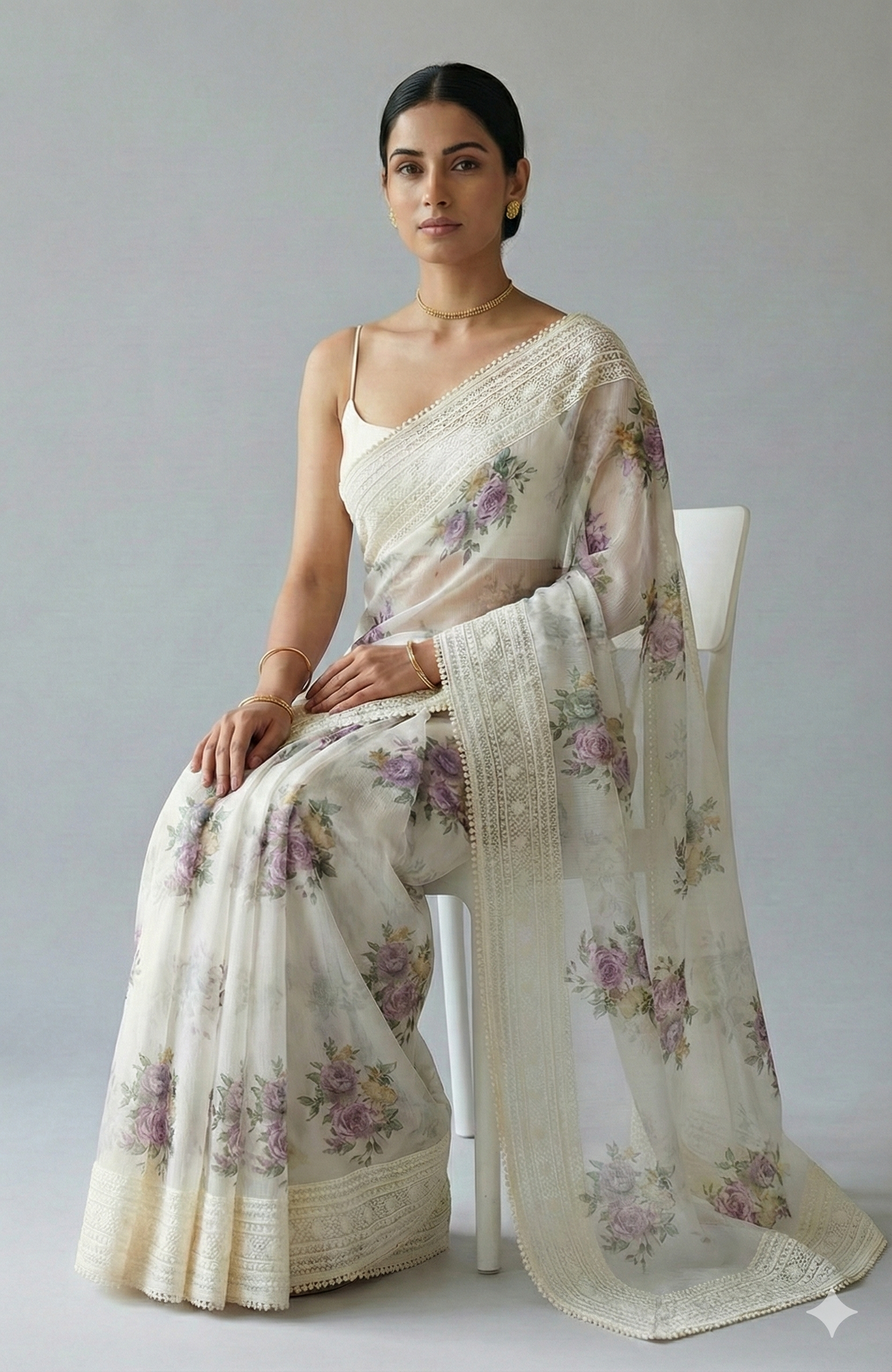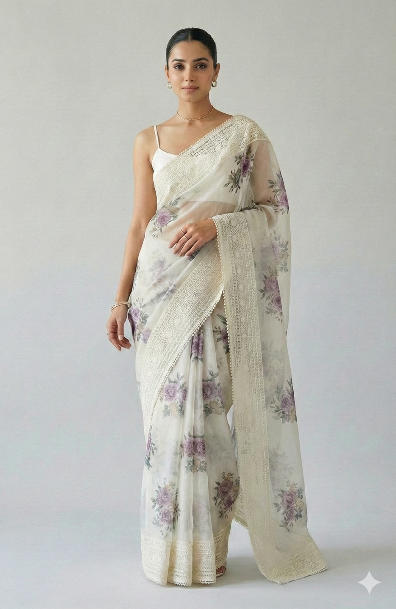 The Eshani Pure Super Net Saree is a study in delicate craftsmanship and whisper-light elegance. Rendered in premium super net, the saree pairs a softly sheer body with carefully placed floral sprays that float across the drape, creating a gentle, poetic rhythm through the pleats. Perfect for evening soirees, reception events, bridal ceremonies, cultured gatherings, and any special-occasion setting where a soft, refined presence is desired.