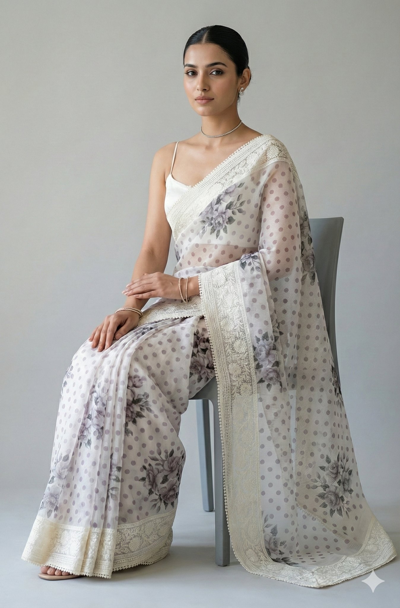 Delicate Motifs – Scattered floral sprays and a dotted ground create a soft, feminine rhythm across the saree.