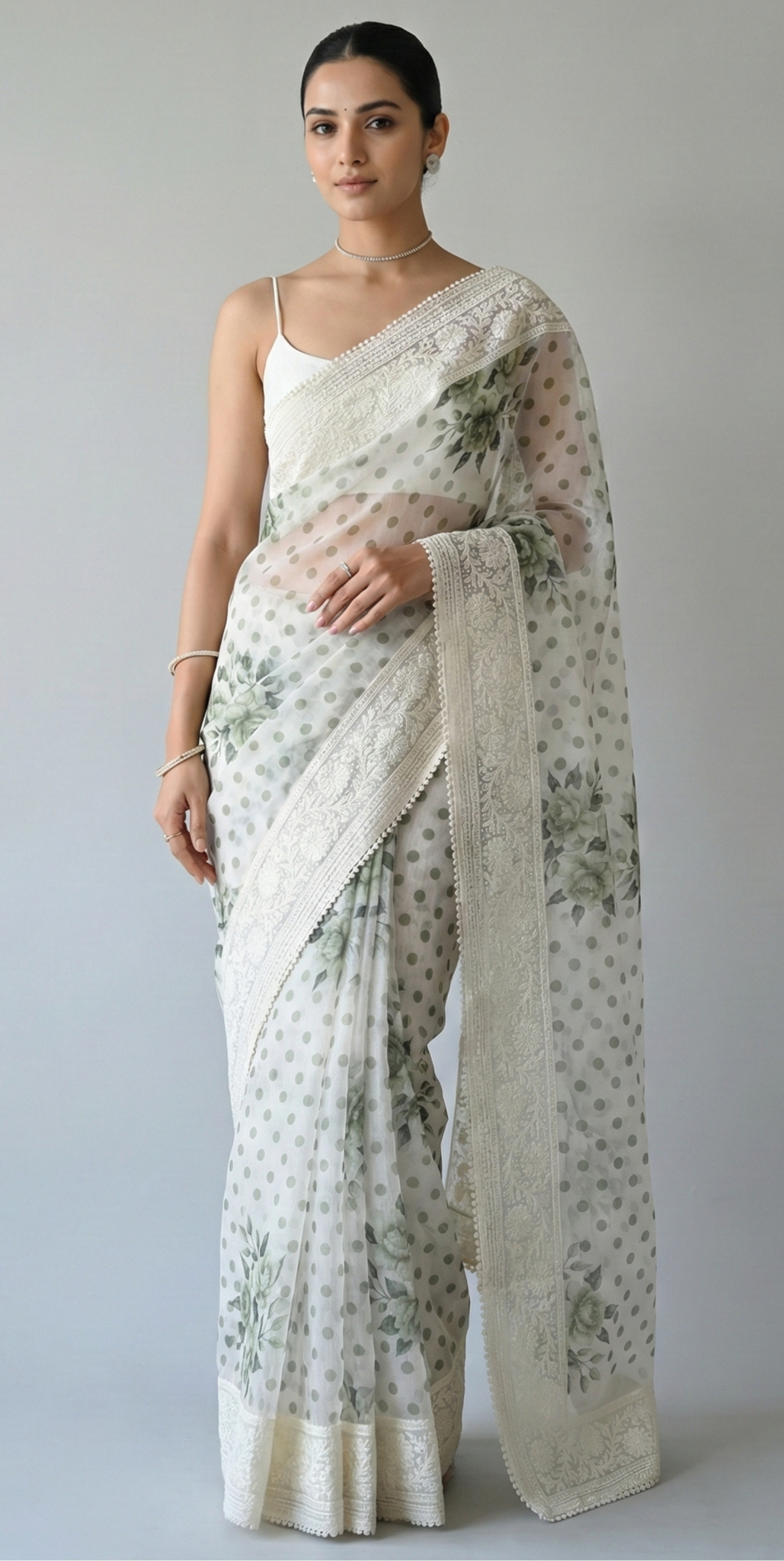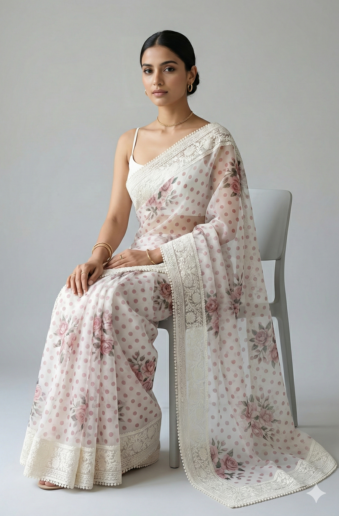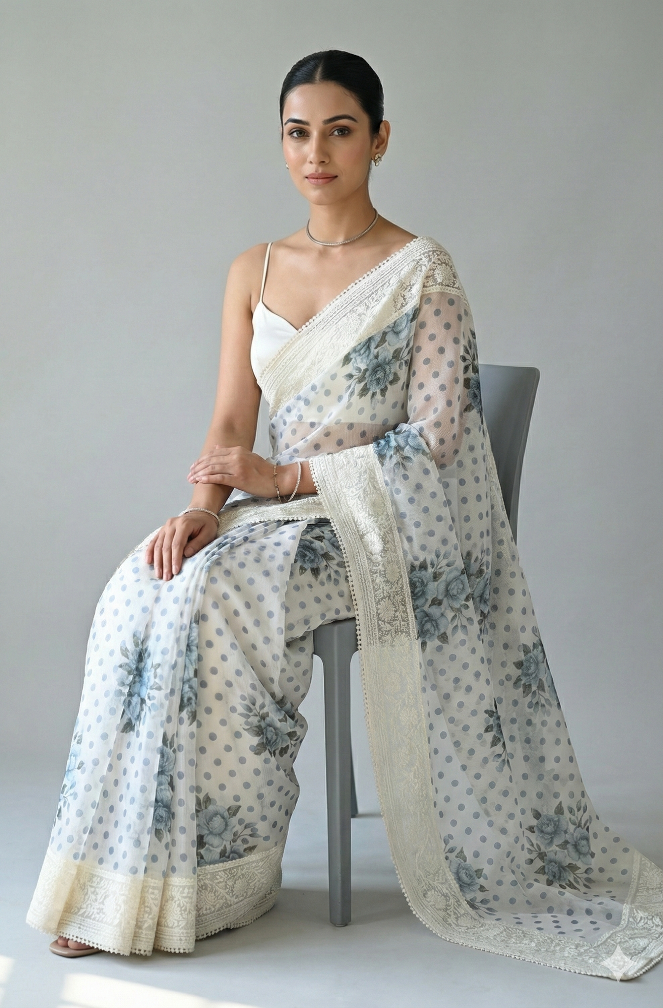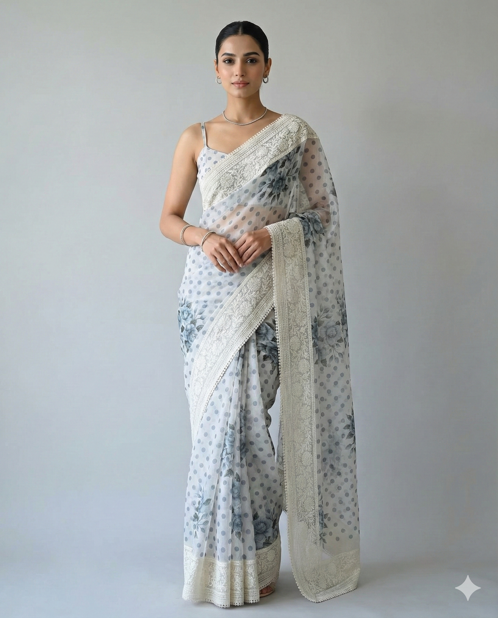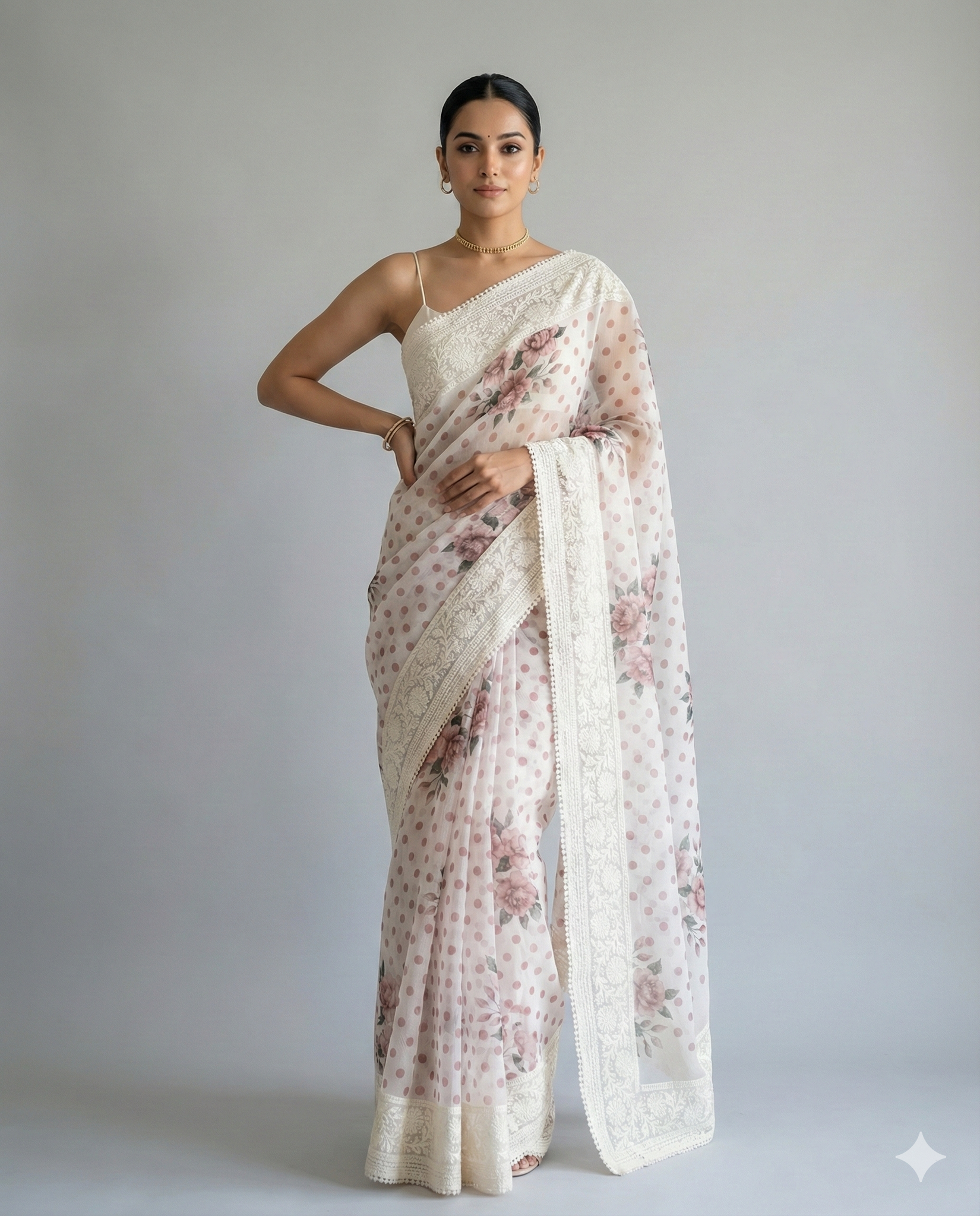 The Maya Pure Super Net Saree is a study in whisper-light elegance and finely wrought detail. Crafted in premium super net, the saree features a subtle dotted texture across the body that creates a delicate, rhythmic backdrop for scattered floral sprays placed thoughtfully through the pleats. The highlight is the exquisitely worked lace border — a broad, embroidered floral vine that frames the drape with refined complexity. Perfect for evening soirees, reception events, bridal functions, cultured ceremonies, and special-occasion gatherings where a light, ethereal presence is desired.