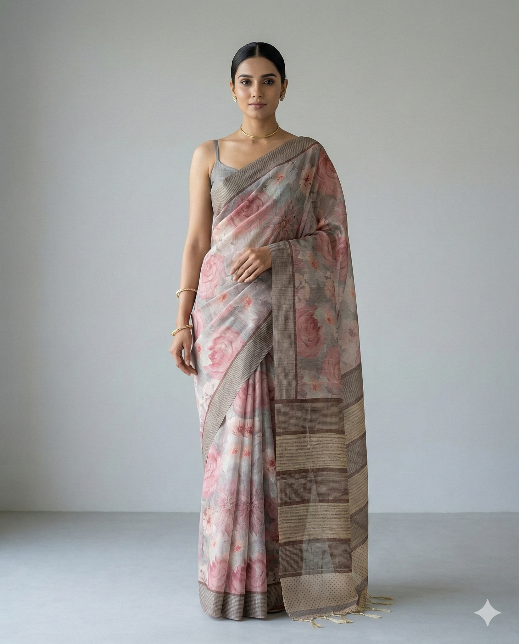 The Rohini Bloom Semi Tussar Saree is a celebration of painterly florals rendered on a textured, slub-rich semi tussar ground. The body carries large-scale floral motifs in a loose, watercolor-like composition that reads both artistic and sophisticated. These blooms are arranged in an all-over pattern that flows naturally into the pleats, creating movement and a soft visual cadence as you walk. The border is deliberately restrained with fine linear weaving that frames the silhouette without competing with the floral field. Perfect for daytime festivities, cultural events, casual receptions, gallery openings, and office ethnic days where you want to look thoughtfully curated without being overly formal.