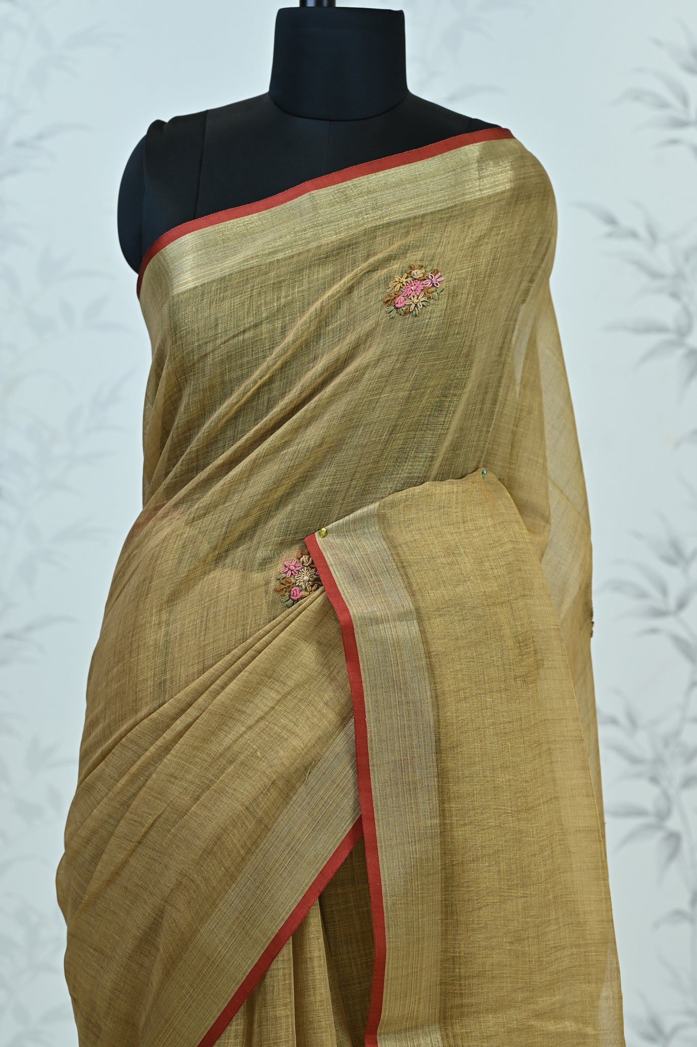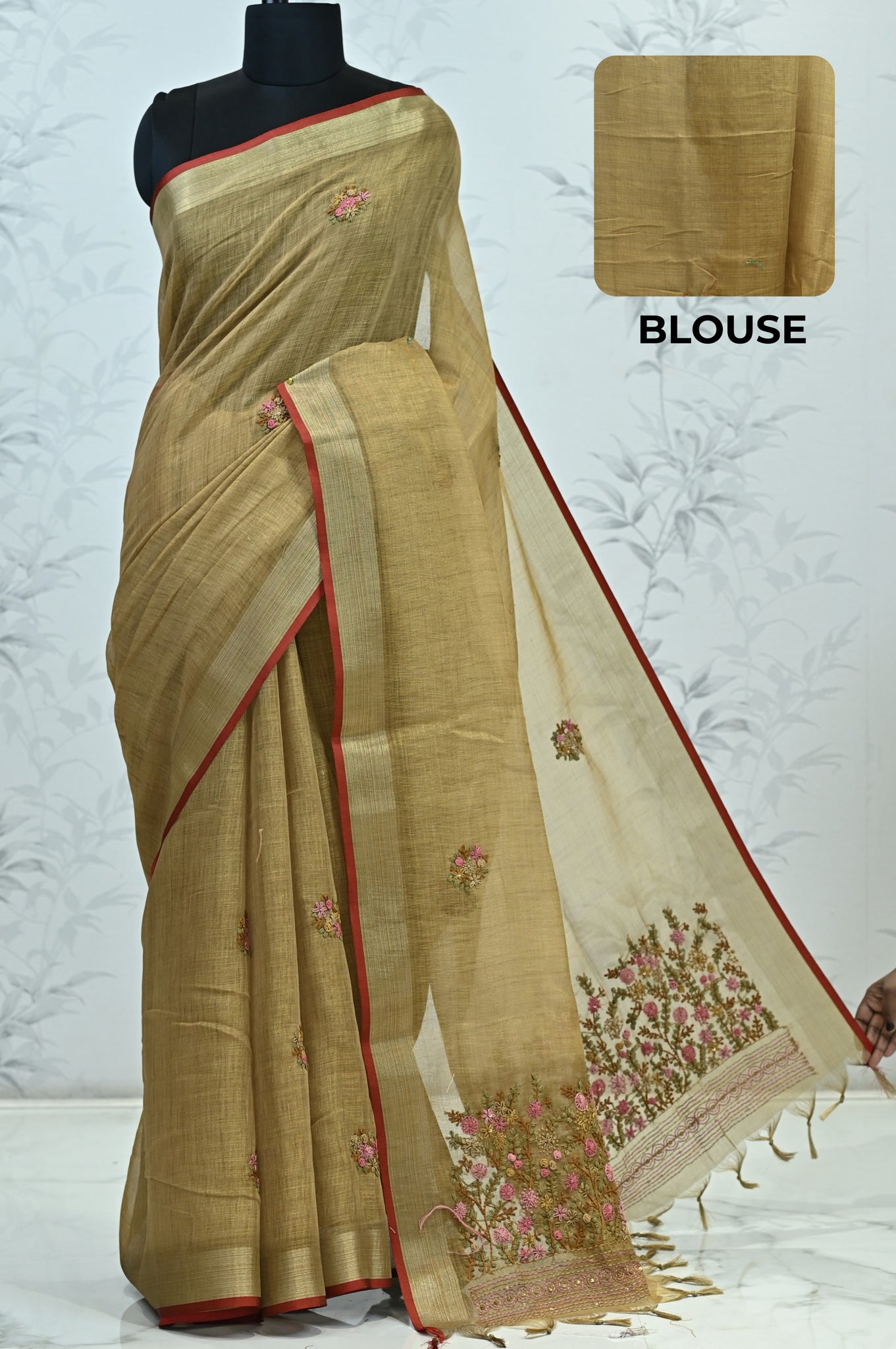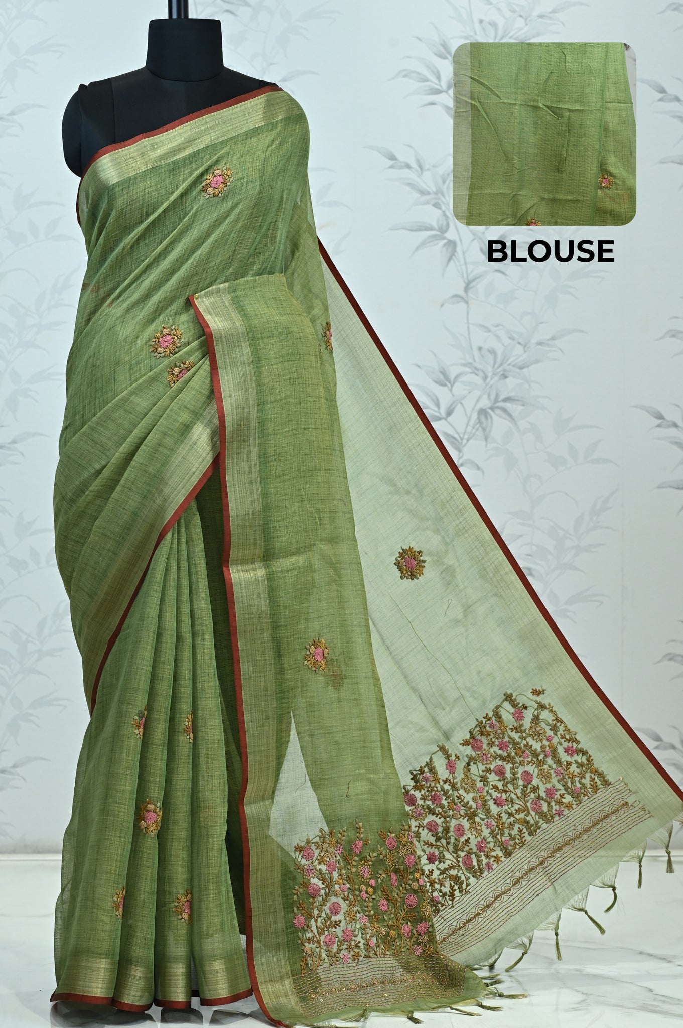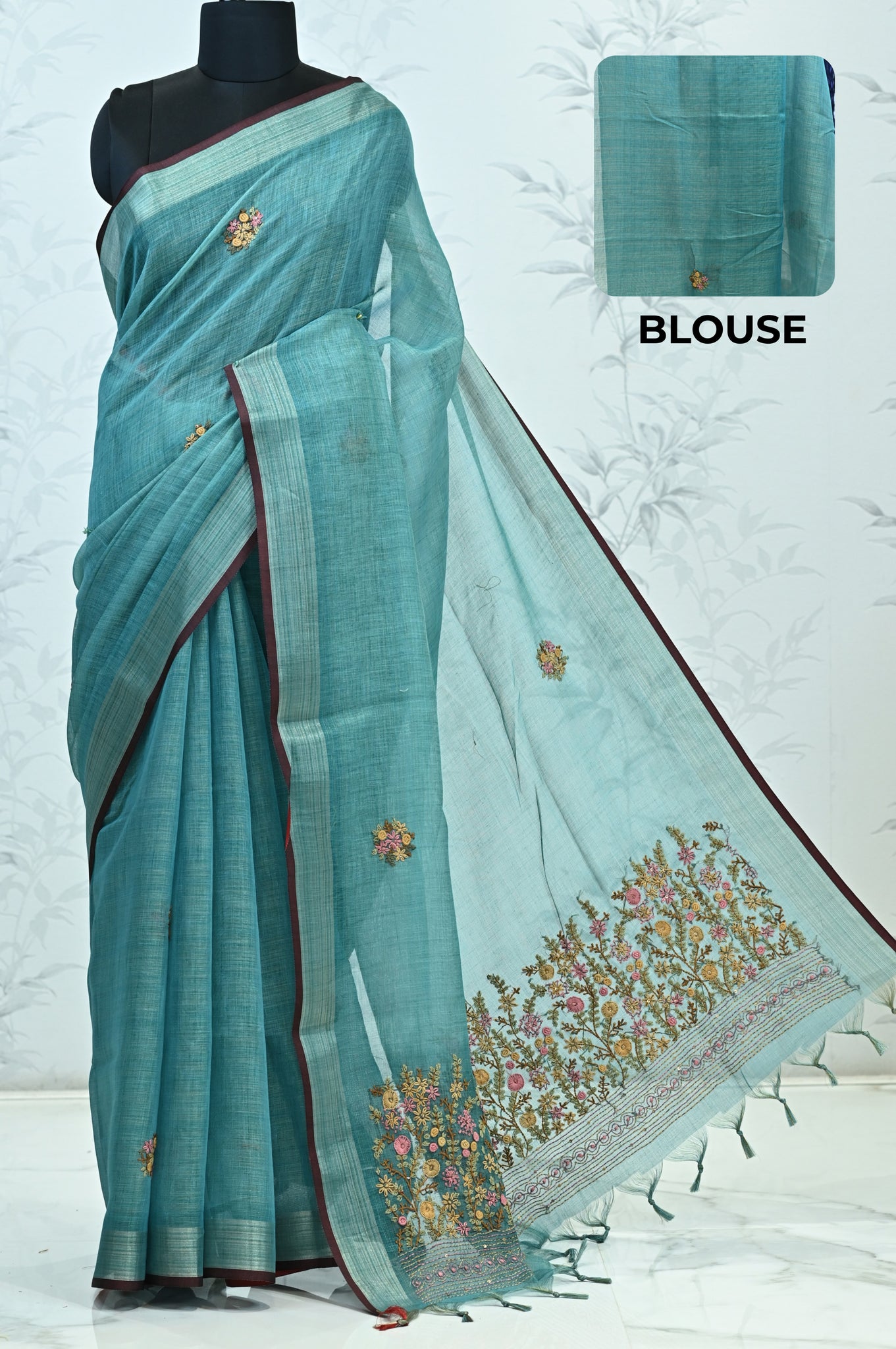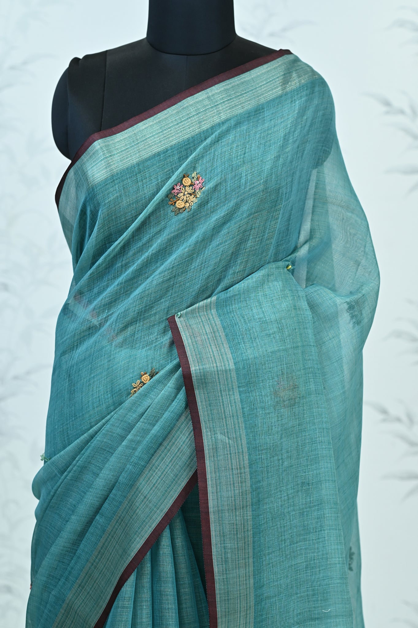 Hand-Embroidered Pallu – A concentrated floral embroidery at the pallu creates a crafted focal point and rich visual interest.