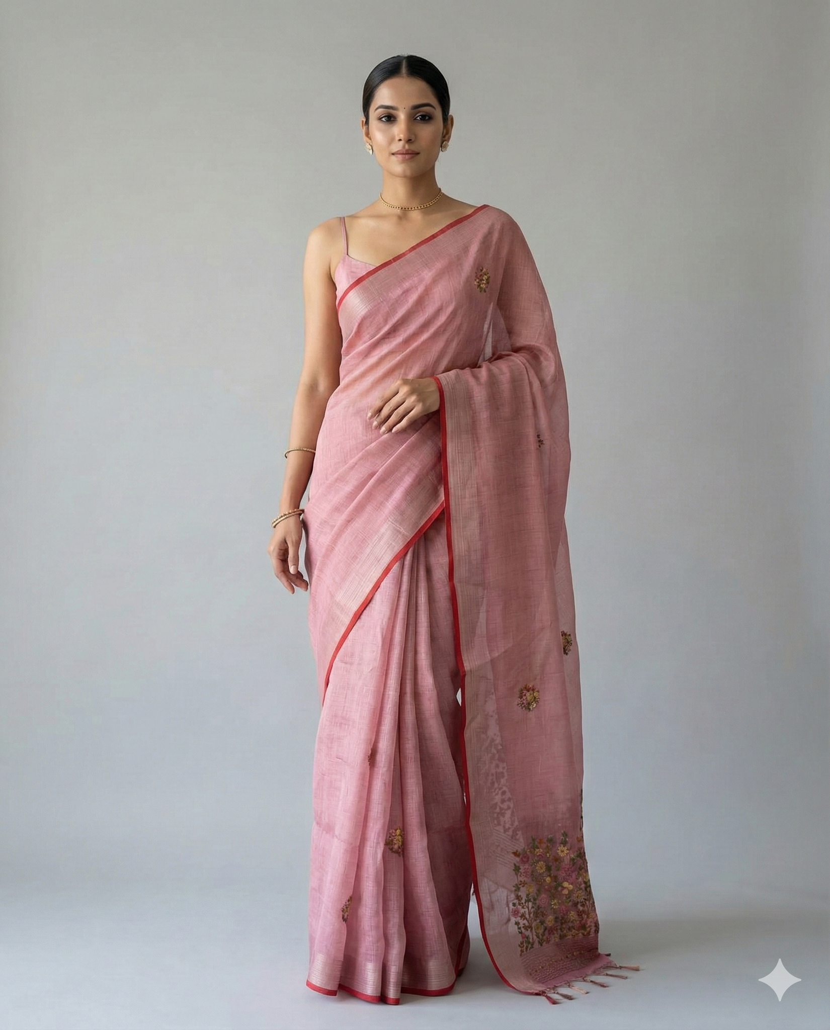The Saanvi Bloom Linen Tissue Sareecelebrates lightweight luxury and handcrafted detail. Woven in fine linen-tissue, the saree offers a crisp, semi-sheer body that layers with a graceful, airy fall. The main field is punctuated with delicate, regularly spaced floral butis that create a soft, rhythmic texture across the pleats. Perfect for daytime festivities, cultural gatherings, elegant brunches, office ethnic days, and intimate ceremonial occasions — an ideal choice when you want artisanal detail with a light, poised drape.