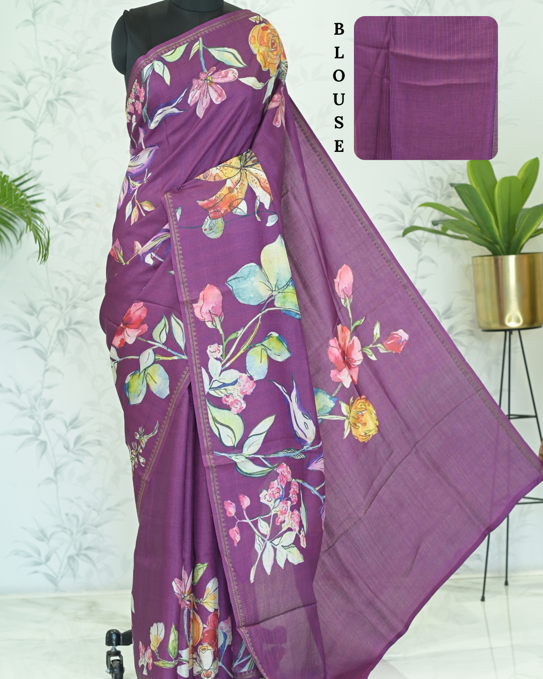 Samantha Blossom Tussar Silk Saree Eggplant Saree featured